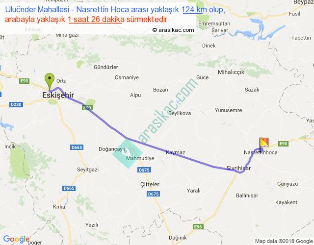 Uluönder Mahallesi - Nasrettin Hoca arası yaklaşık olarak 90 km/h ile yukarıda belirtilen sürede olup, iki yerin kuş uçuşu uzaklığı (mesafesi) 105'dir. Yolculuk otobüsle 1 saat 51 dakika sürmektedir.