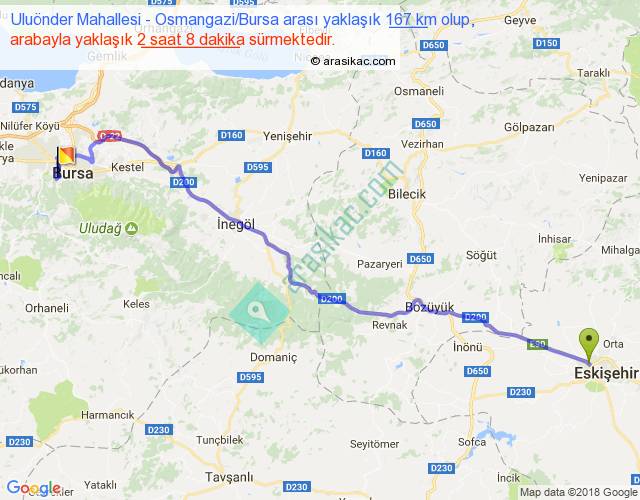 Uluönder Mahallesi - Osmangazi Bursa arası yaklaşık olarak 90 km/h ile yukarıda belirtilen sürede olup, iki yerin kuş uçuşu uzaklığı (mesafesi) 131'dir. Yolculuk otobüsle 2 saat 46 dakika sürmektedir.