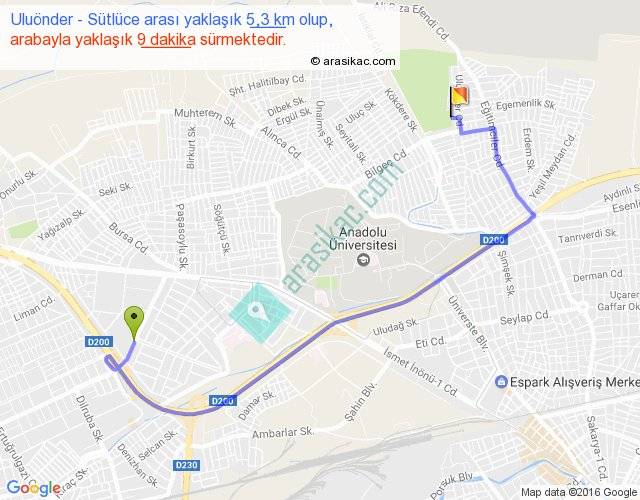 Uluönder - Sütlüce arası yaklaşık olarak 90 km/h ile yukarıda belirtilen sürede olup, iki yerin kuş uçuşu uzaklığı (mesafesi) 3'dir. Yolculuk otobüsle 11 dakika sürmektedir.