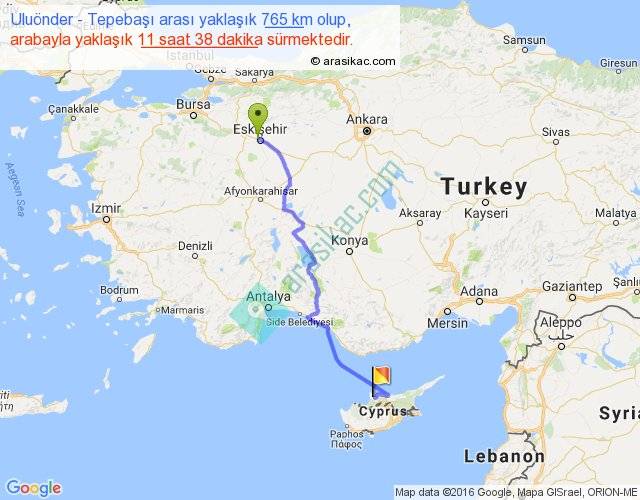 Uluönder - Tepebaşı arası yaklaşık olarak 90 km/h ile yukarıda belirtilen sürede olup, iki yerin kuş uçuşu uzaklığı (mesafesi) 544'dir. Eğer belirtilen yerler arasında uçak seferi var ise bu süre uçakla 50 dakika'ya kadar düşebilir. Yolculuk otobüsle 15 saat 7 dakika sürmektedir.