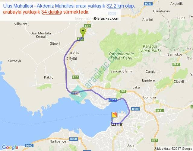 Ulus Mahallesi - Akdeniz Mahallesi arası yaklaşık olarak 90 km/h ile yukarıda belirtilen sürede olup, iki yerin kuş uçuşu uzaklığı (mesafesi) 17'dir. Yolculuk otobüsle 44 dakika sürmektedir.