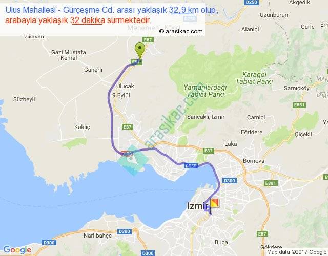 Ulus Mahallesi - Gürçeşme Cd. arası yaklaşık olarak 90 km/h ile yukarıda belirtilen sürede olup, iki yerin kuş uçuşu uzaklığı (mesafesi) 20'dir. Yolculuk otobüsle 41 dakika sürmektedir.