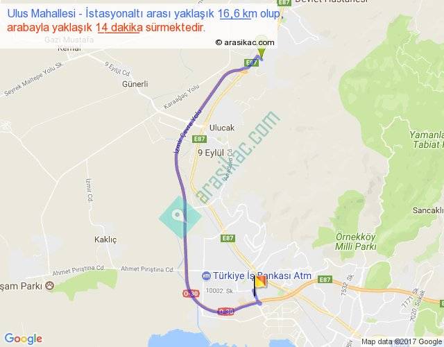 Ulus Mahallesi - İstasyonaltı arası yaklaşık olarak 90 km/h ile yukarıda belirtilen sürede olup, iki yerin kuş uçuşu uzaklığı (mesafesi) 10'dir. Yolculuk otobüsle 18 dakika sürmektedir.