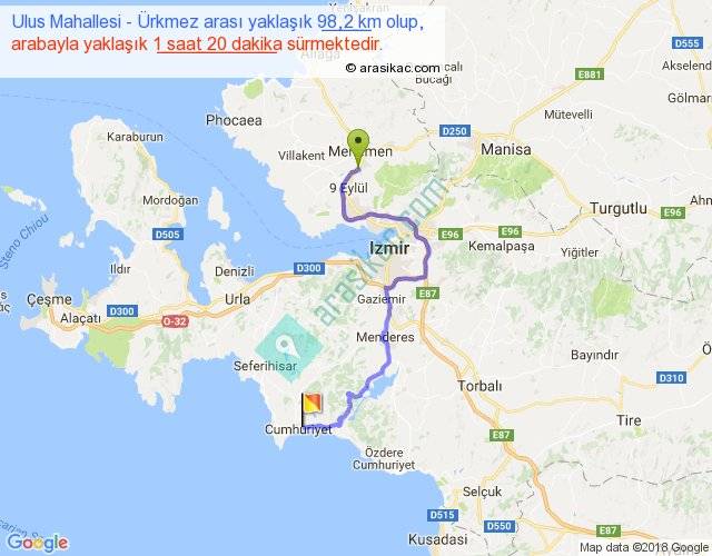 Ulus Mahallesi - Ürkmez arası yaklaşık olarak 90 km/h ile yukarıda belirtilen sürede olup, iki yerin kuş uçuşu uzaklığı (mesafesi) 56'dir. Yolculuk otobüsle 1 saat 44 dakika sürmektedir.