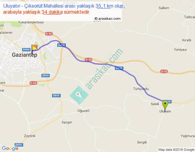 Uluyatır - Çıksorut Mahallesi arası yaklaşık olarak 90 km/h ile yukarıda belirtilen sürede olup, iki yerin kuş uçuşu uzaklığı (mesafesi) 29'dir. Yolculuk otobüsle 44 dakika sürmektedir.