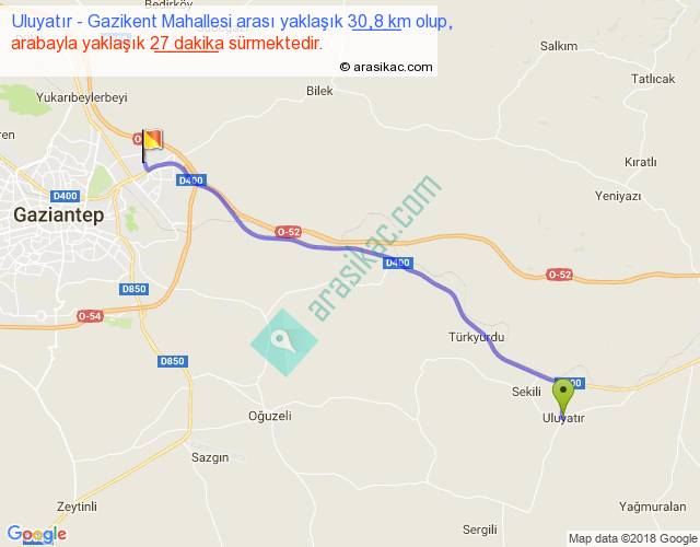 Uluyatır - Gazikent Mahallesi arası yaklaşık olarak 90 km/h ile yukarıda belirtilen sürede olup, iki yerin kuş uçuşu uzaklığı (mesafesi) 27'dir. Yolculuk otobüsle 35 dakika sürmektedir.