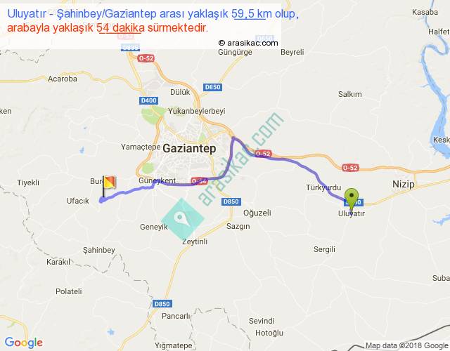 Uluyatır - Şahinbey Gaziantep arası yaklaşık olarak 90 km/h ile yukarıda belirtilen sürede olup, iki yerin kuş uçuşu uzaklığı (mesafesi) 43'dir. Yolculuk otobüsle 1 saat 10 dakika sürmektedir.