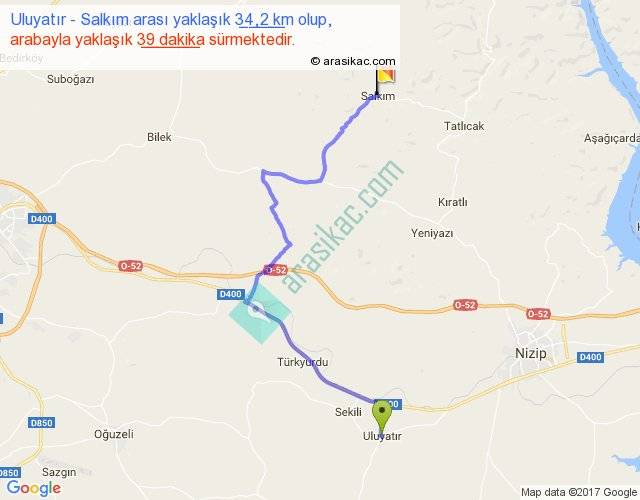 Uluyatır - Salkım arası yaklaşık olarak 90 km/h ile yukarıda belirtilen sürede olup, iki yerin kuş uçuşu uzaklığı (mesafesi) 21'dir. Yolculuk otobüsle 50 dakika sürmektedir.