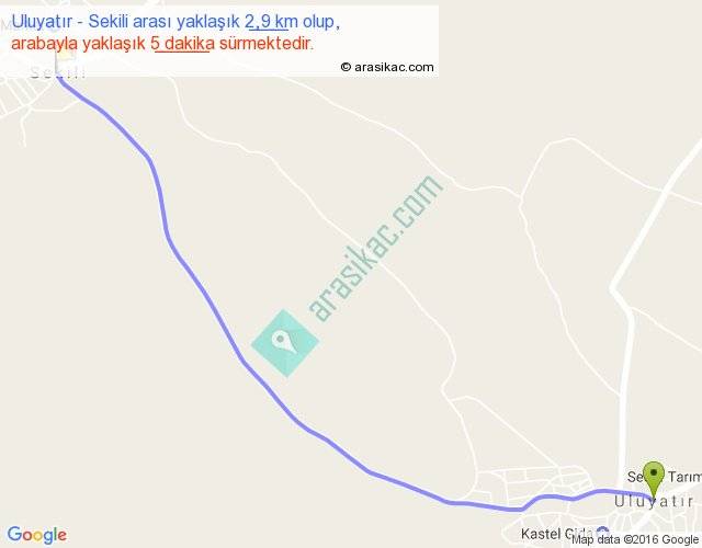 Uluyatır - Sekili arası yaklaşık olarak 90 km/h ile yukarıda belirtilen sürede olup, iki yerin kuş uçuşu uzaklığı (mesafesi) 3'dir. Yolculuk otobüsle 6 dakika sürmektedir.