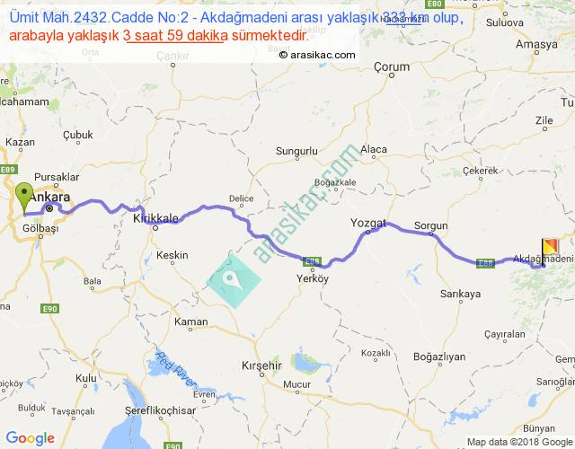 Ümit Mah.2432.Cadde No:2 - Akdağmadeni arası yaklaşık olarak 90 km/h ile yukarıda belirtilen sürede olup, iki yerin kuş uçuşu uzaklığı (mesafesi) 271'dir. Eğer belirtilen yerler arasında uçak seferi var ise bu süre uçakla 25 dakika'ya kadar düşebilir. Yolculuk otobüsle 5 saat 10 dakika sürmektedir.