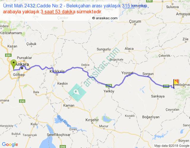 Ümit Mah.2432.Cadde No:2 - Belekçahan arası yaklaşık olarak 90 km/h ile yukarıda belirtilen sürede olup, iki yerin kuş uçuşu uzaklığı (mesafesi) 253'dir. Eğer belirtilen yerler arasında uçak seferi var ise bu süre uçakla 23 dakika'ya kadar düşebilir. Yolculuk otobüsle 5 saat 2 dakika sürmektedir.