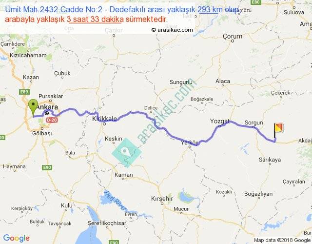 Ümit Mah.2432.Cadde No:2 - Dedefakılı arası yaklaşık olarak 90 km/h ile yukarıda belirtilen sürede olup, iki yerin kuş uçuşu uzaklığı (mesafesi) 232'dir. Yolculuk otobüsle 4 saat 36 dakika sürmektedir.