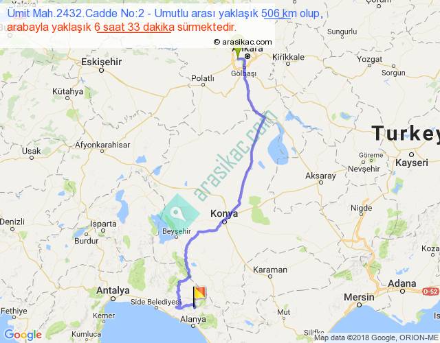 Ümit Mah.2432.Cadde No:2 - Umutlu arası yaklaşık olarak 90 km/h ile yukarıda belirtilen sürede olup, iki yerin kuş uçuşu uzaklığı (mesafesi) 350'dir. Eğer belirtilen yerler arasında uçak seferi var ise bu süre uçakla 32 dakika'ya kadar düşebilir. Yolculuk otobüsle 8 saat 30 dakika sürmektedir.