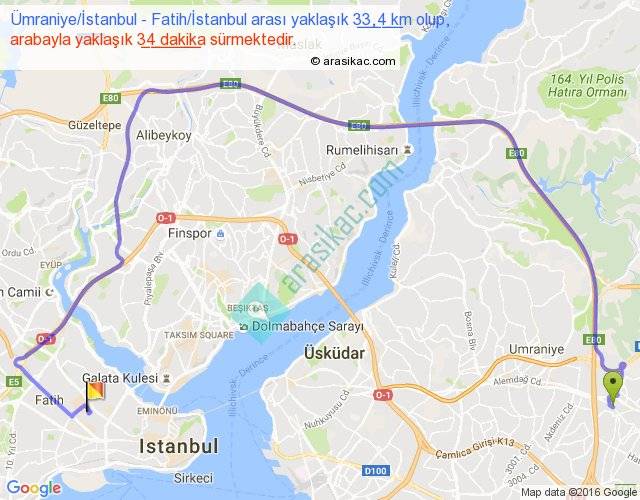 Ümraniye İstanbul - Fatih İstanbul arası yaklaşık olarak 90 km/h ile yukarıda belirtilen sürede olup, iki yerin kuş uçuşu uzaklığı (mesafesi) 15'dir. Yolculuk otobüsle 44 dakika sürmektedir.
