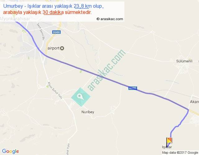 Umurbey - Işıklar arası yaklaşık olarak 90 km/h ile yukarıda belirtilen sürede olup, iki yerin kuş uçuşu uzaklığı (mesafesi) 19'dir. Yolculuk otobüsle 39 dakika sürmektedir.
