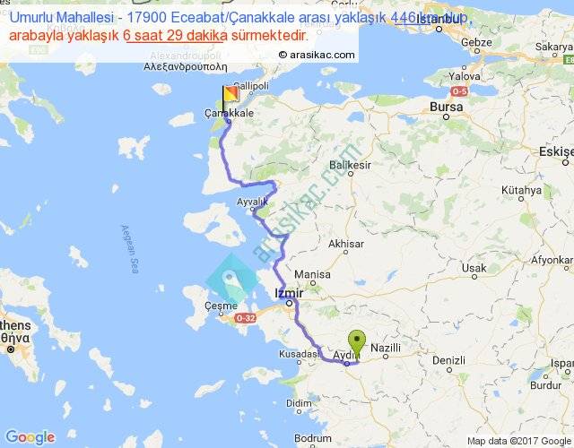 Umurlu Mahallesi - 17900 Eceabat Çanakkale arası yaklaşık olarak 90 km/h ile yukarıda belirtilen sürede olup, iki yerin kuş uçuşu uzaklığı (mesafesi) 297'dir. Eğer belirtilen yerler arasında uçak seferi var ise bu süre uçakla 27 dakika'ya kadar düşebilir. Yolculuk otobüsle 8 saat 25 dakika sürmektedir.