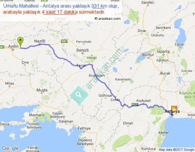Umurlu Mahallesi - Antalya arası yaklaşık olarak 90 km/h ile yukarıda belirtilen sürede olup, iki yerin kuş uçuşu uzaklığı (mesafesi) 263'dir. Eğer belirtilen yerler arasında uçak seferi var ise bu süre uçakla 24 dakika'ya kadar düşebilir. Yolculuk otobüsle 5 saat 34 dakika sürmektedir.