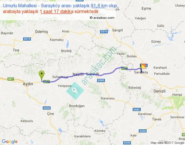 Umurlu Mahallesi - Sarayköy arası yaklaşık olarak 90 km/h ile yukarıda belirtilen sürede olup, iki yerin kuş uçuşu uzaklığı (mesafesi) 83'dir. Yolculuk otobüsle 1 saat 40 dakika sürmektedir.