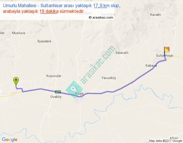 Umurlu Mahallesi - Sultanhisar arası yaklaşık olarak 90 km/h ile yukarıda belirtilen sürede olup, iki yerin kuş uçuşu uzaklığı (mesafesi) 16'dir. Yolculuk otobüsle 24 dakika sürmektedir.