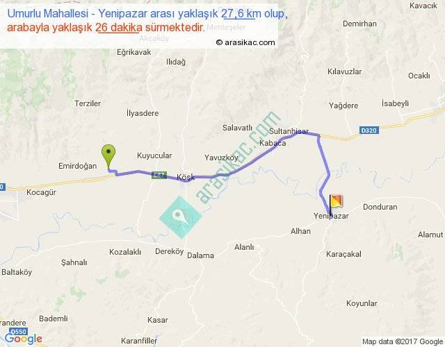Umurlu Mahallesi - Yenipazar arası yaklaşık olarak 90 km/h ile yukarıda belirtilen sürede olup, iki yerin kuş uçuşu uzaklığı (mesafesi) 20'dir. Yolculuk otobüsle 33 dakika sürmektedir.