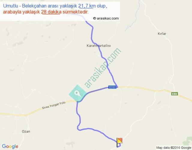 Umutlu - Belekçahan arası yaklaşık olarak 90 km/h ile yukarıda belirtilen sürede olup, iki yerin kuş uçuşu uzaklığı (mesafesi) 14'dir. Yolculuk otobüsle 36 dakika sürmektedir.