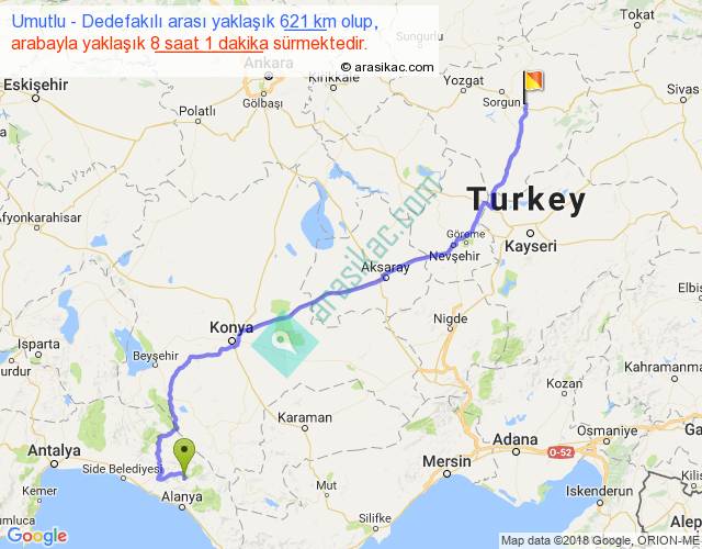 Umutlu - Dedefakılı arası yaklaşık olarak 90 km/h ile yukarıda belirtilen sürede olup, iki yerin kuş uçuşu uzaklığı (mesafesi) 440'dir. Eğer belirtilen yerler arasında uçak seferi var ise bu süre uçakla 40 dakika'ya kadar düşebilir. Yolculuk otobüsle 10 saat 25 dakika sürmektedir.