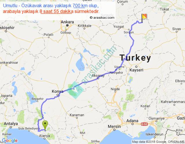 Umutlu - Özükavak arası yaklaşık olarak 90 km/h ile yukarıda belirtilen sürede olup, iki yerin kuş uçuşu uzaklığı (mesafesi) 481'dir. Eğer belirtilen yerler arasında uçak seferi var ise bu süre uçakla 44 dakika'ya kadar düşebilir. Yolculuk otobüsle 11 saat 35 dakika sürmektedir.