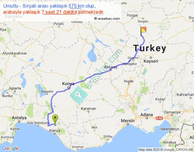 Umutlu - Sırçalı arası yaklaşık olarak 90 km/h ile yukarıda belirtilen sürede olup, iki yerin kuş uçuşu uzaklığı (mesafesi) 392'dir. Eğer belirtilen yerler arasında uçak seferi var ise bu süre uçakla 36 dakika'ya kadar düşebilir. Yolculuk otobüsle 9 saat 33 dakika sürmektedir.