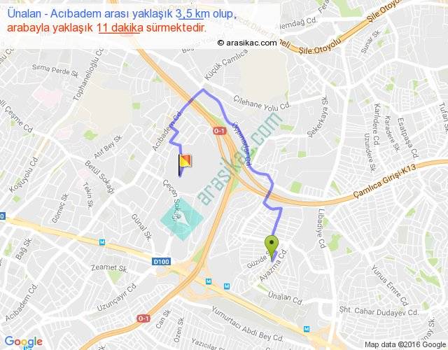 Ünalan - Acıbadem arası yaklaşık olarak 90 km/h ile yukarıda belirtilen sürede olup, iki yerin kuş uçuşu uzaklığı (mesafesi) 1'dir. Yolculuk otobüsle 14 dakika sürmektedir.