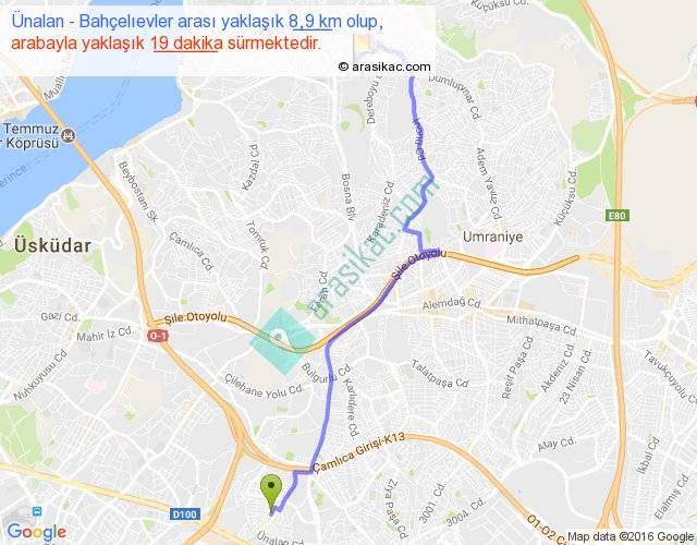 Ünalan - Bahçelıevler arası yaklaşık olarak 90 km/h ile yukarıda belirtilen sürede olup, iki yerin kuş uçuşu uzaklığı (mesafesi) 6'dir. Yolculuk otobüsle 24 dakika sürmektedir.