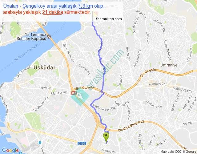 Ünalan - Çengelköy arası yaklaşık olarak 90 km/h ile yukarıda belirtilen sürede olup, iki yerin kuş uçuşu uzaklığı (mesafesi) 6'dir. Yolculuk otobüsle 27 dakika sürmektedir.