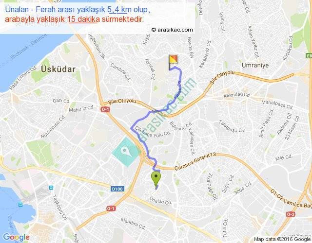 Ünalan - Ferah arası yaklaşık olarak 90 km/h ile yukarıda belirtilen sürede olup, iki yerin kuş uçuşu uzaklığı (mesafesi) 4'dir. Yolculuk otobüsle 19 dakika sürmektedir.