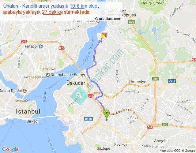 Ünalan - Kandilli arası yaklaşık olarak 90 km/h ile yukarıda belirtilen sürede olup, iki yerin kuş uçuşu uzaklığı (mesafesi) 7'dir. Yolculuk otobüsle 35 dakika sürmektedir.