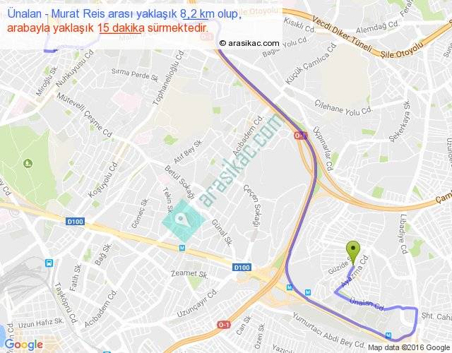 Ünalan - Murat Reis arası yaklaşık olarak 90 km/h ile yukarıda belirtilen sürede olup, iki yerin kuş uçuşu uzaklığı (mesafesi) 4'dir. Yolculuk otobüsle 19 dakika sürmektedir.