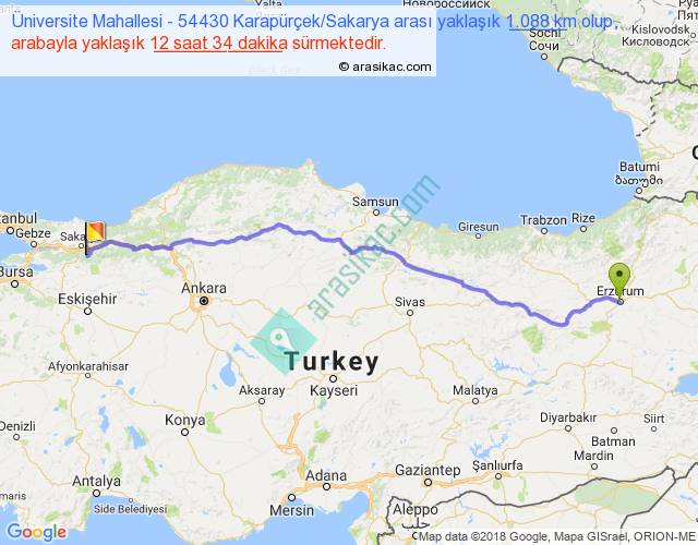 Üniversite Mahallesi - 54430 Karapürçek Sakarya arası yaklaşık olarak 90 km/h ile yukarıda belirtilen sürede olup, iki yerin kuş uçuşu uzaklığı (mesafesi) 909'dir. Eğer belirtilen yerler arasında uçak seferi var ise bu süre uçakla 1 saat 23 dakika'ya kadar düşebilir. Yolculuk otobüsle 16 saat 20 dakika sürmektedir.