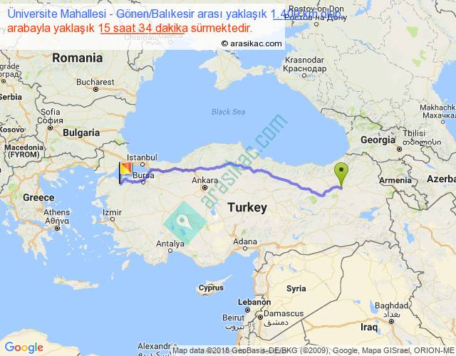 Üniversite Mahallesi - Gönen Balıkesir arası yaklaşık olarak 90 km/h ile yukarıda belirtilen sürede olup, iki yerin kuş uçuşu uzaklığı (mesafesi) 1151'dir. Eğer belirtilen yerler arasında uçak seferi var ise bu süre uçakla 1 saat 46 dakika'ya kadar düşebilir. Yolculuk otobüsle 20 saat 14 dakika sürmektedir.