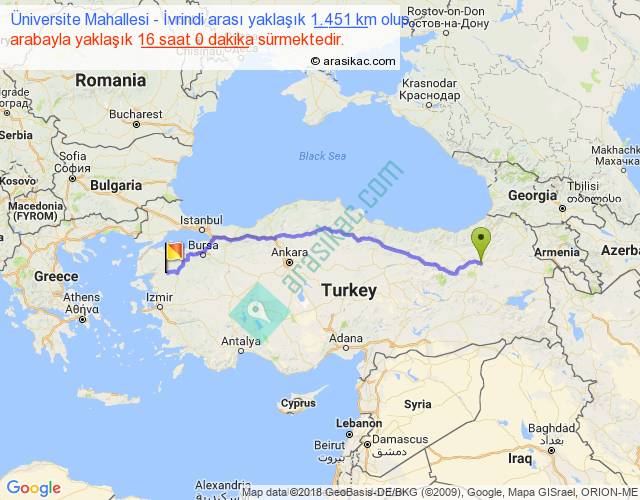 Üniversite Mahallesi - İvrindi arası yaklaşık olarak 90 km/h ile yukarıda belirtilen sürede olup, iki yerin kuş uçuşu uzaklığı (mesafesi) 1169'dir. Eğer belirtilen yerler arasında uçak seferi var ise bu süre uçakla 1 saat 47 dakika'ya kadar düşebilir. Yolculuk otobüsle 20 saat 48 dakika sürmektedir.