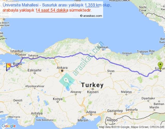 Üniversite Mahallesi - Susurluk arası yaklaşık olarak 90 km/h ile yukarıda belirtilen sürede olup, iki yerin kuş uçuşu uzaklığı (mesafesi) 1109'dir. Eğer belirtilen yerler arasında uçak seferi var ise bu süre uçakla 1 saat 42 dakika'ya kadar düşebilir. Yolculuk otobüsle 19 saat 22 dakika sürmektedir.