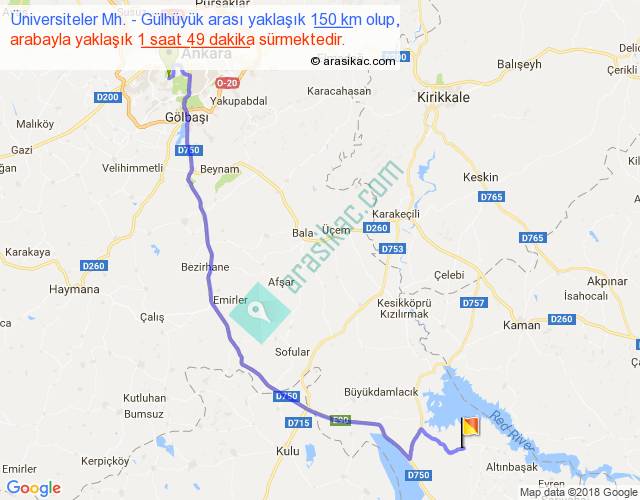 Üniversiteler Mh. - Gülhüyük arası yaklaşık olarak 90 km/h ile yukarıda belirtilen sürede olup, iki yerin kuş uçuşu uzaklığı (mesafesi) 111'dir. Yolculuk otobüsle 2 saat 21 dakika sürmektedir.