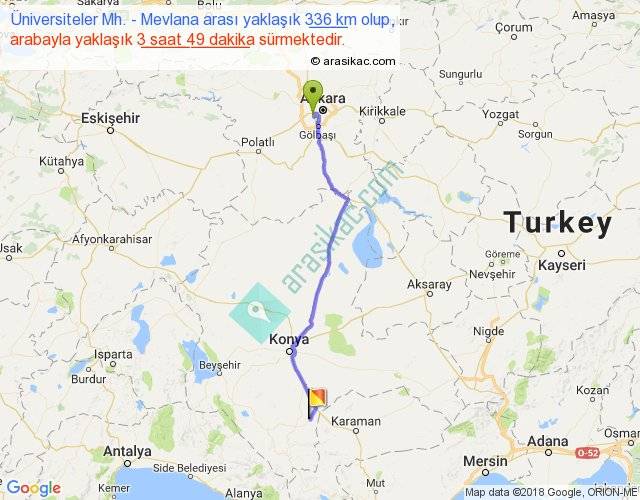 Üniversiteler Mh. - Mevlana arası yaklaşık olarak 90 km/h ile yukarıda belirtilen sürede olup, iki yerin kuş uçuşu uzaklığı (mesafesi) 287'dir. Eğer belirtilen yerler arasında uçak seferi var ise bu süre uçakla 26 dakika'ya kadar düşebilir. Yolculuk otobüsle 4 saat 57 dakika sürmektedir.