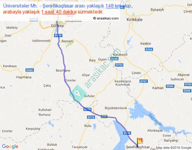 Üniversiteler Mh. - Şereflikoçhisar arası yaklaşık olarak 90 km/h ile yukarıda belirtilen sürede olup, iki yerin kuş uçuşu uzaklığı (mesafesi) 124'dir. Yolculuk otobüsle 2 saat 10 dakika sürmektedir.