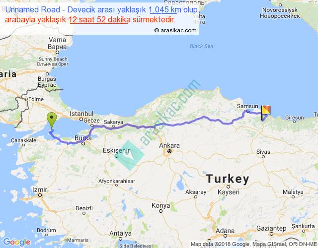 Unnamed Road - Devecik arası yaklaşık olarak 90 km/h ile yukarıda belirtilen sürede olup, iki yerin kuş uçuşu uzaklığı (mesafesi) 780'dir. Eğer belirtilen yerler arasında uçak seferi var ise bu süre uçakla 1 saat 12 dakika'ya kadar düşebilir. Yolculuk otobüsle 16 saat 43 dakika sürmektedir.