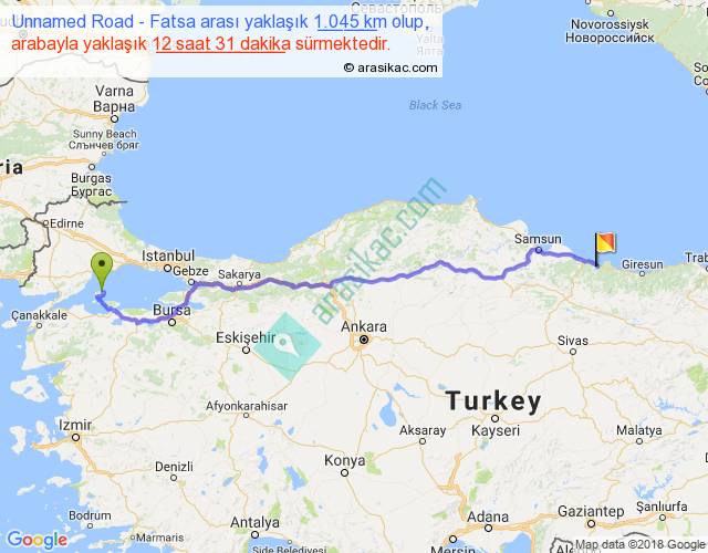 Unnamed Road - Fatsa arası yaklaşık olarak 90 km/h ile yukarıda belirtilen sürede olup, iki yerin kuş uçuşu uzaklığı (mesafesi) 823'dir. Eğer belirtilen yerler arasında uçak seferi var ise bu süre uçakla 1 saat 15 dakika'ya kadar düşebilir. Yolculuk otobüsle 16 saat 16 dakika sürmektedir.