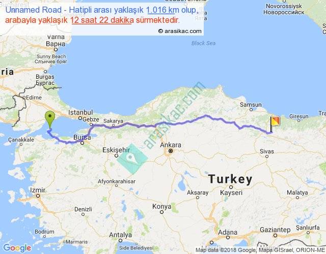 Unnamed Road - Hatipli arası yaklaşık olarak 90 km/h ile yukarıda belirtilen sürede olup, iki yerin kuş uçuşu uzaklığı (mesafesi) 802'dir. Eğer belirtilen yerler arasında uçak seferi var ise bu süre uçakla 1 saat 14 dakika'ya kadar düşebilir. Yolculuk otobüsle 16 saat 4 dakika sürmektedir.