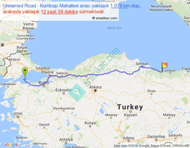 Unnamed Road - Kumbaşı Mahallesi arası yaklaşık olarak 90 km/h ile yukarıda belirtilen sürede olup, iki yerin kuş uçuşu uzaklığı (mesafesi) 851'dir. Eğer belirtilen yerler arasında uçak seferi var ise bu süre uçakla 1 saat 18 dakika'ya kadar düşebilir. Yolculuk otobüsle 16 saat 51 dakika sürmektedir.