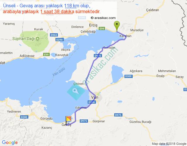 Ünseli - Gevaş arası yaklaşık olarak 90 km/h ile yukarıda belirtilen sürede olup, iki yerin kuş uçuşu uzaklığı (mesafesi) 86'dir. Yolculuk otobüsle 2 saat 7 dakika sürmektedir.