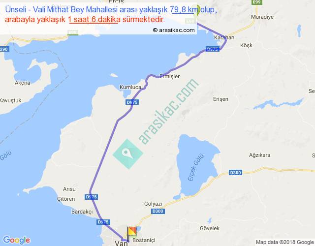 Ünseli - Vali Mithat Bey Mahallesi arası yaklaşık olarak 90 km/h ile yukarıda belirtilen sürede olup, iki yerin kuş uçuşu uzaklığı (mesafesi) 55'dir. Yolculuk otobüsle 1 saat 25 dakika sürmektedir.
