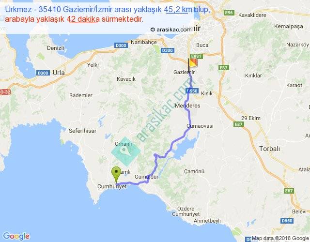 Ürkmez - 35410 Gaziemir İzmir arası yaklaşık olarak 90 km/h ile yukarıda belirtilen sürede olup, iki yerin kuş uçuşu uzaklığı (mesafesi) 33'dir. Yolculuk otobüsle 54 dakika sürmektedir.