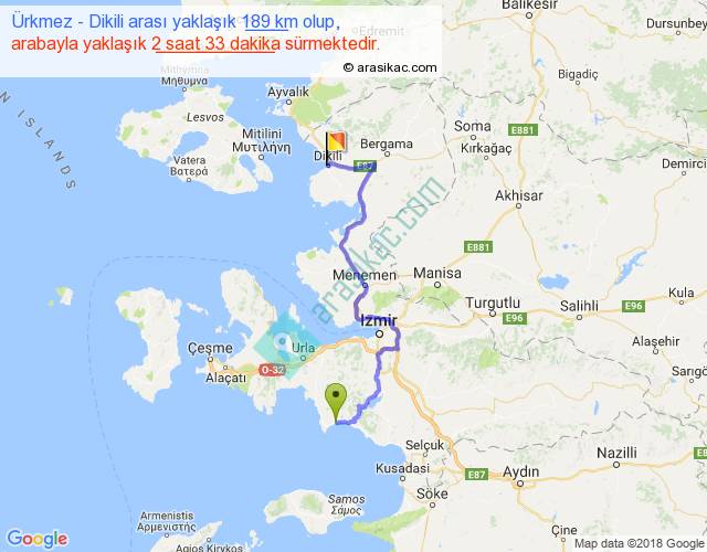 Ürkmez - Dikili arası yaklaşık olarak 90 km/h ile yukarıda belirtilen sürede olup, iki yerin kuş uçuşu uzaklığı (mesafesi) 110'dir. Yolculuk otobüsle 3 saat 18 dakika sürmektedir.