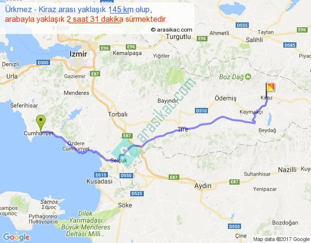 Ürkmez - Kiraz arası yaklaşık olarak 90 km/h ile yukarıda belirtilen sürede olup, iki yerin kuş uçuşu uzaklığı (mesafesi) 112'dir. Yolculuk otobüsle 3 saat 16 dakika sürmektedir.